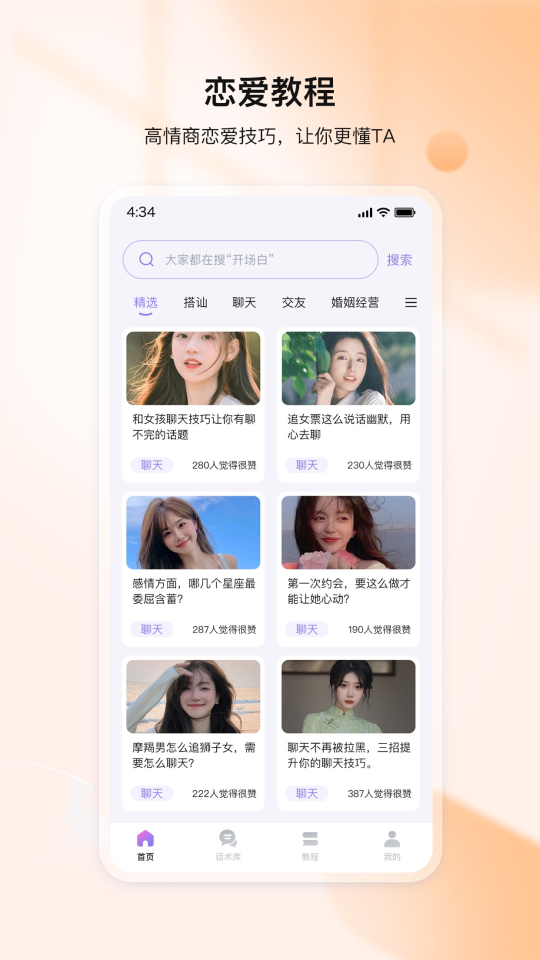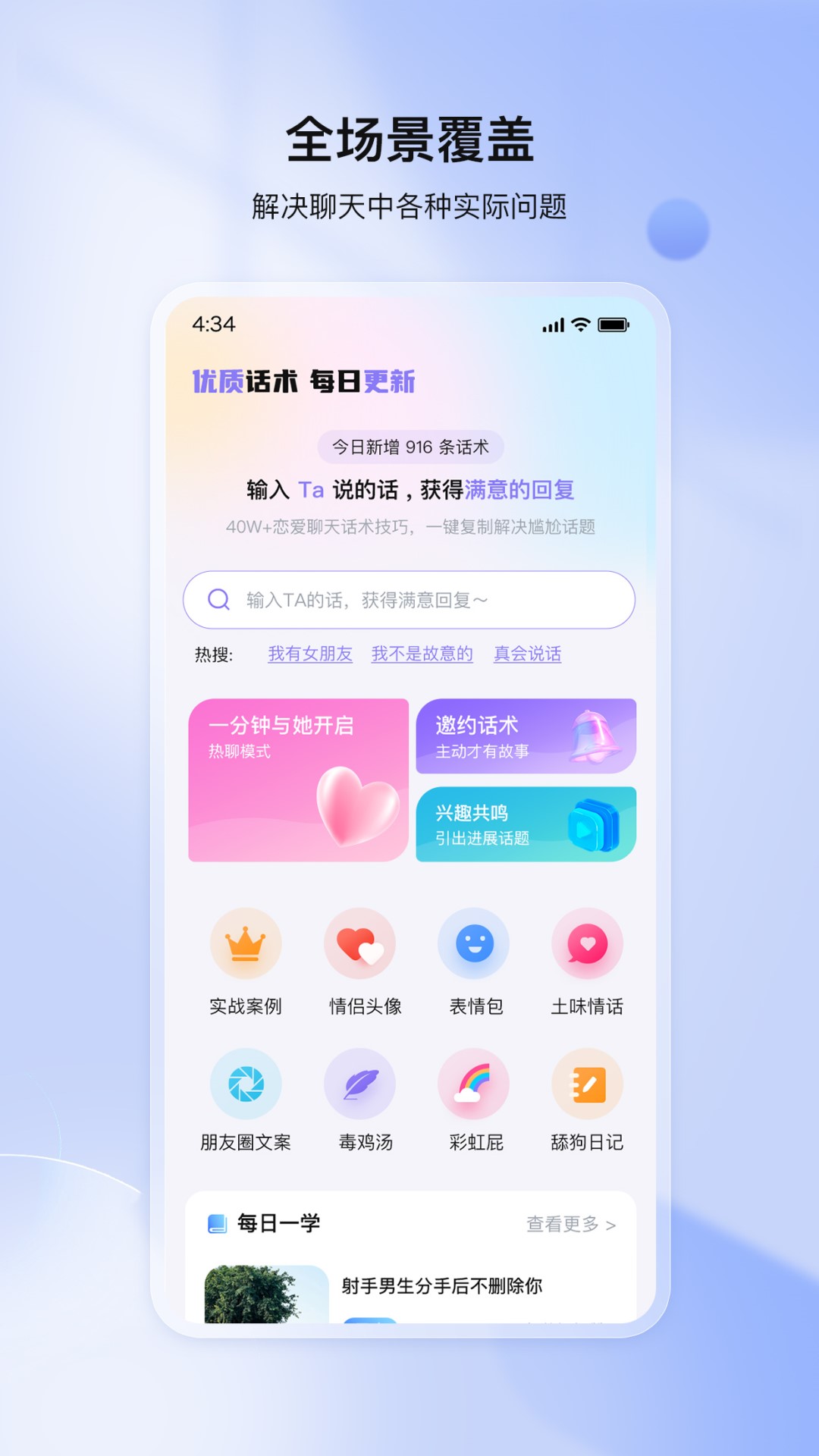 聊神话术APP是一款免费查看聊天话术内容,提升我们社交实力的社交必备软件,按照互动的场景,大家可以得到不同对话方案,让社恐人员轻松知晓我们改如何处理尴尬的聊天过程,平台还有专属情侣们的恋爱话术内容,无法理解女朋友表达内容的,可以跟着恋爱大神学习看看哦!