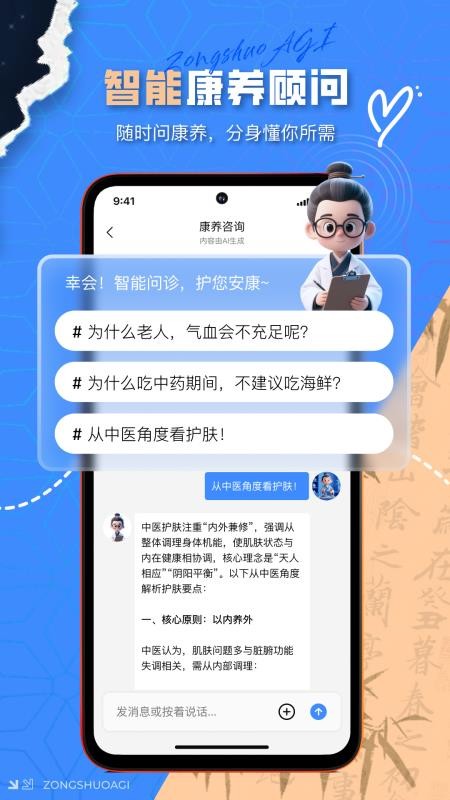 宗朔AGI软件是一款结合人工智能与传统文化的智能健康助手,致力于为用户提供全方位的健康管理和健康指导,软件通过先进的技术和个人化服务,帮助用户实现智慧对话、轻松互动,并提供线上专属的康养管家服务,确保用户的身心健康得到全面关注和维护。app通过结合现代科技与传统文化,提供了一种全新的健康管理方式,让用户能够轻松实现健康生活的各种目标。