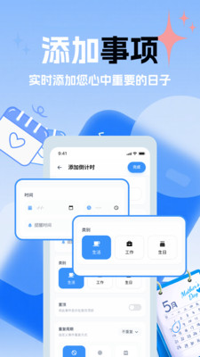 2、记录宝宝成长天数、结婚周年,事项添加可附图片,秒表精准计时适合运动场景,日程清晰展示闲忙时段。