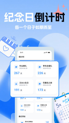 倒计时纪念日提醒app是一个能够帮助大家高效的规划管理时间的手机助手,这款软件提供便捷的记录和提醒功能,可以随时添加纪念日或事项提醒,灵活的添加和管理不同事项,让日程管理变得更便捷高效。还包含了专注计时和精准米秒表功能,用户可以根据自己的需要设置和调整专注时间,让自己在专注时间内保持高效的工作或者学习状态。