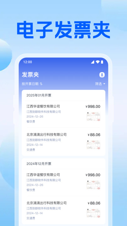 3、自动整理发票,按照时间、金额、类型等维度进行排序,方便用户查看和管理。