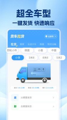 1、这款APP车型特全,小面、中货车都有,支持一键发货,系统智能匹配附近司机,拉货不用等太久。