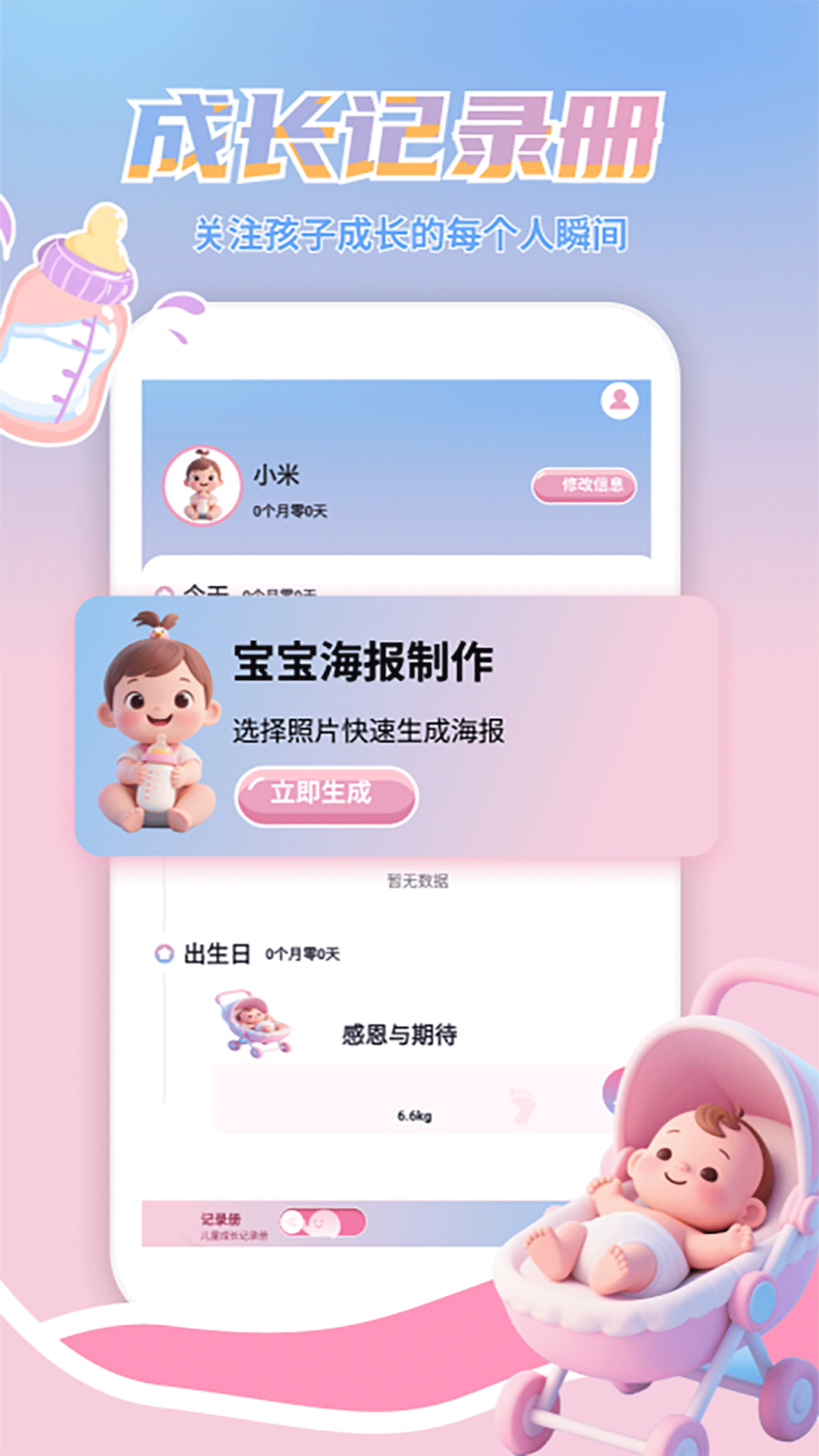1、成长时间轴,动态展示孩子的成长轨迹,让父母直观感受时间的魔力与孩子的蜕变。