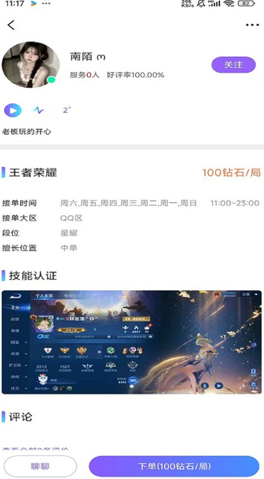 1、推荐列表清晰展示对方的游戏战绩、陪玩评价及在线状态。