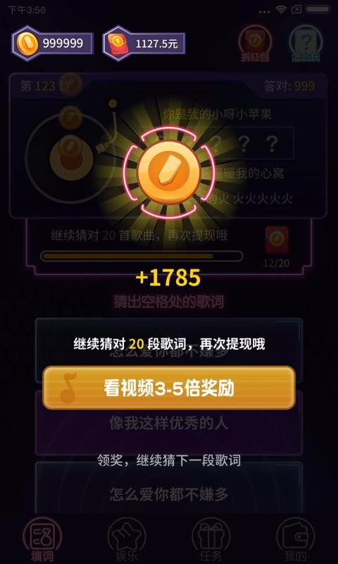 1、应用集成猜歌词和填词游戏功能,用户通过正确填写歌曲缺失部分获得金币奖励,游戏形式多样且趣味性强。