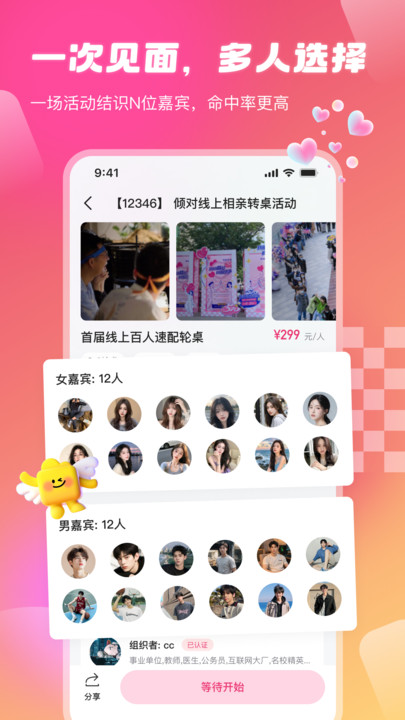 1、采用轮桌相亲机制,大大提高了用户的交友效率,让用户在较短的时间内了解更多潜在伴侣。