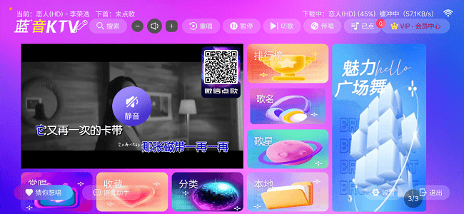 1、app主页,提供了多个板块功能可进入,可边点唱边进行其他操作。
