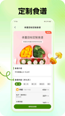 4、支持食物查询,还可以根据用户的体重目标制定食谱,还有很多健康食谱推荐。