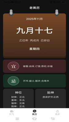 1、还整合了权威的老黄历信息,涵盖每日宜忌、吉时凶时、黄历宜忌等内容。