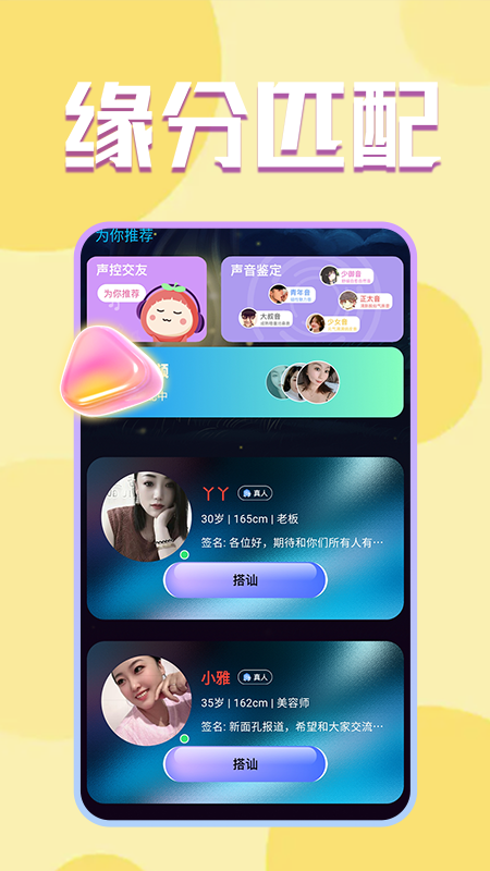 2、依据用户设定的择偶标准,通过智能算法匹配出符合心意的对象,助力用户迅速摆脱单身状态。