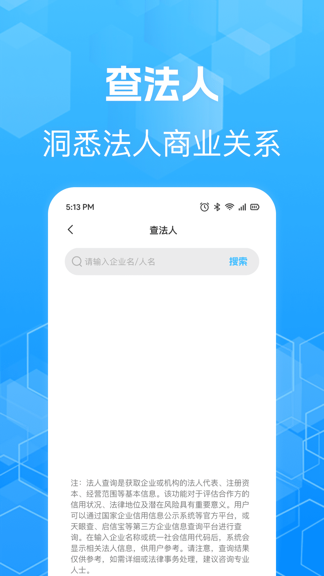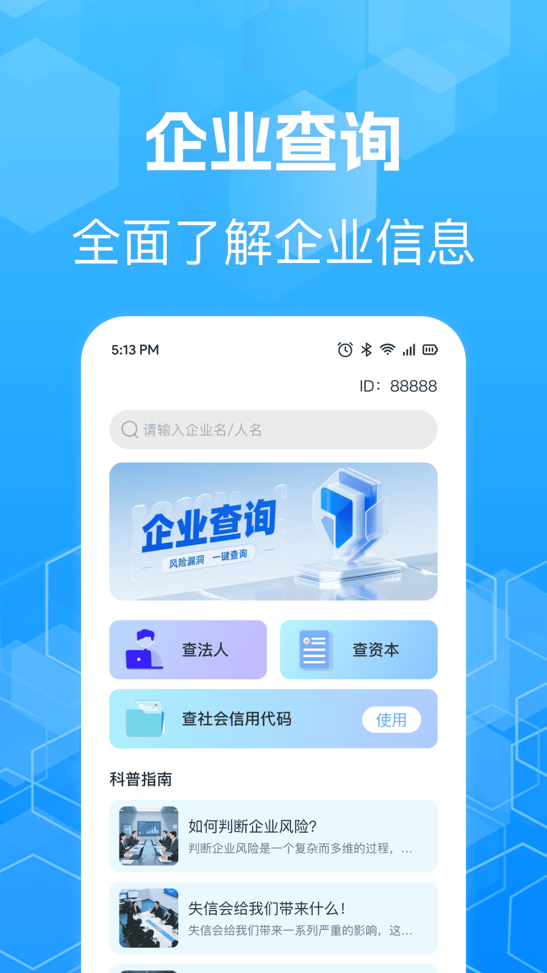 1、用户可以快速查询企业的注册信息、股东结构、注册资本、法定代表人等基本信息,帮助用户全面了解目标企业的基本情况。