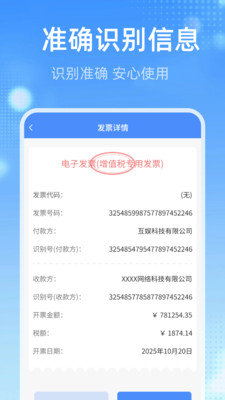 1、高效识别,准确无误,采用先进的OCR识别技术,确保发票信息识别准确率高达99%以上。