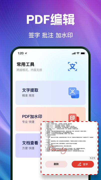 1、首页集成多格式互转功能,支持PDF与Office文档双向转换及电子签名。