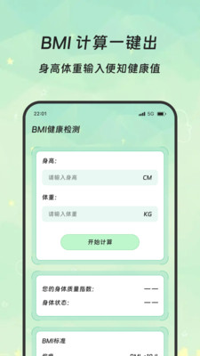 4、BMI计算器,一键测量健康,输入身高体重,立即得出BMI值,助您快速了解自身健康状况。
