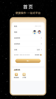 2、打开app就能直接输入姓名,性别、出生时间、出生地点,点击分类为你的亲朋好友算一卦吧。