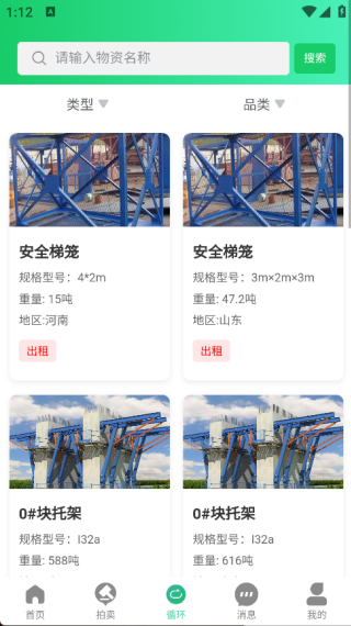 2、进入首页,即可看到租赁循环、物资发布、拍卖中心等功能。