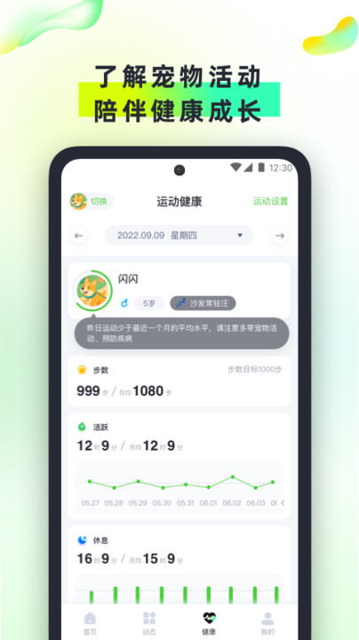 3、宠物活动数据统计功能,帮助主人科学管理宠物健康,还能为选择合适的宠物食品和运动方式提供参考依据。
