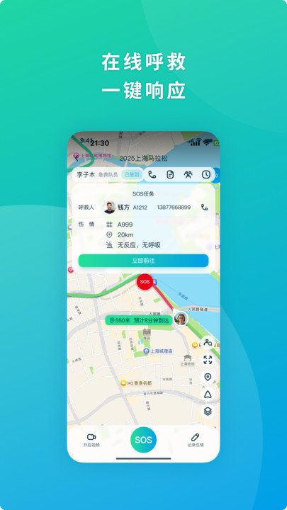 1、一键急救功能,轻按手机屏幕即可拨打紧急联系电话,并同时将自身位置信息发送至医疗团队。