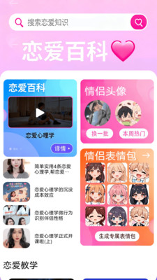 1、海量情侣头像按风格分类,恋爱百科含异地恋维系技巧,支持线上情侣互动任务,拉近彼此距离。