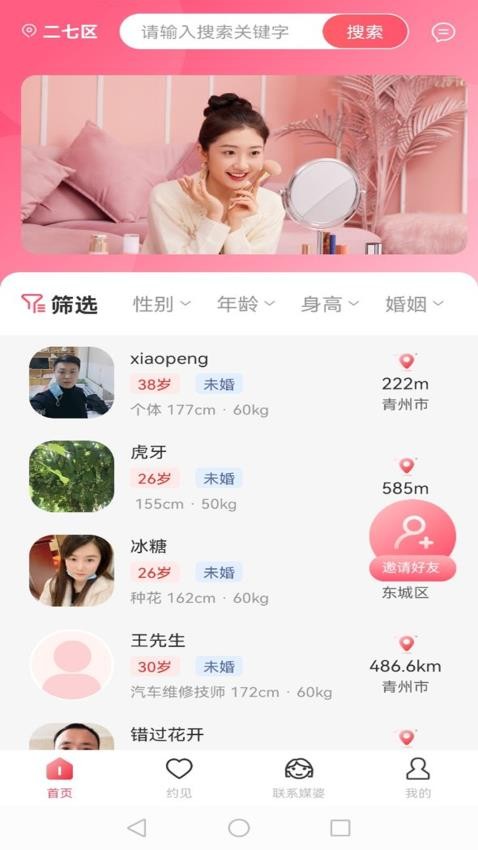 4、来到软件筛选页面可用性别、年龄、名族、婚姻状况、学历等条件筛选。