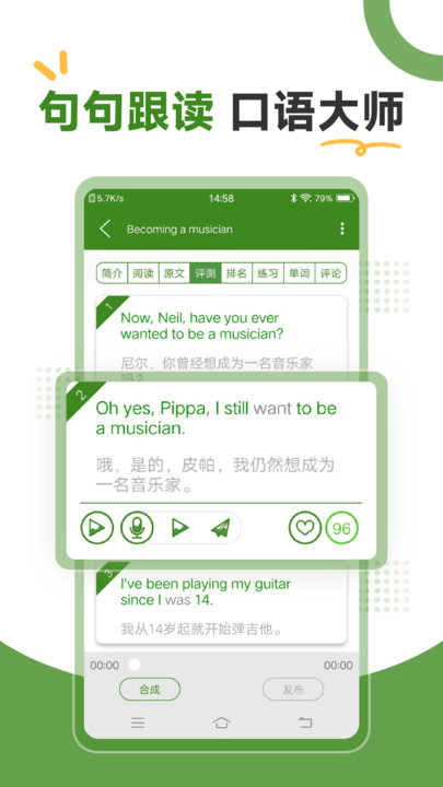 2、搭载语音评估系统,在口语跟读中实时检测发音准确度,通过声谱对比技术提供针对性改进指导。