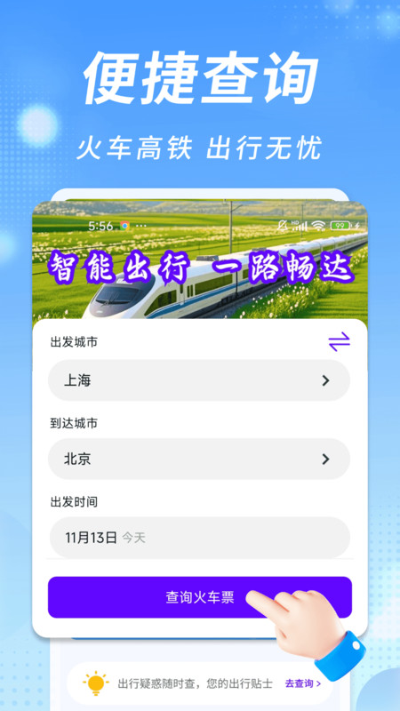 1、完成应用安装后,在首页输入行程信息即可查询实时火车票务数据。