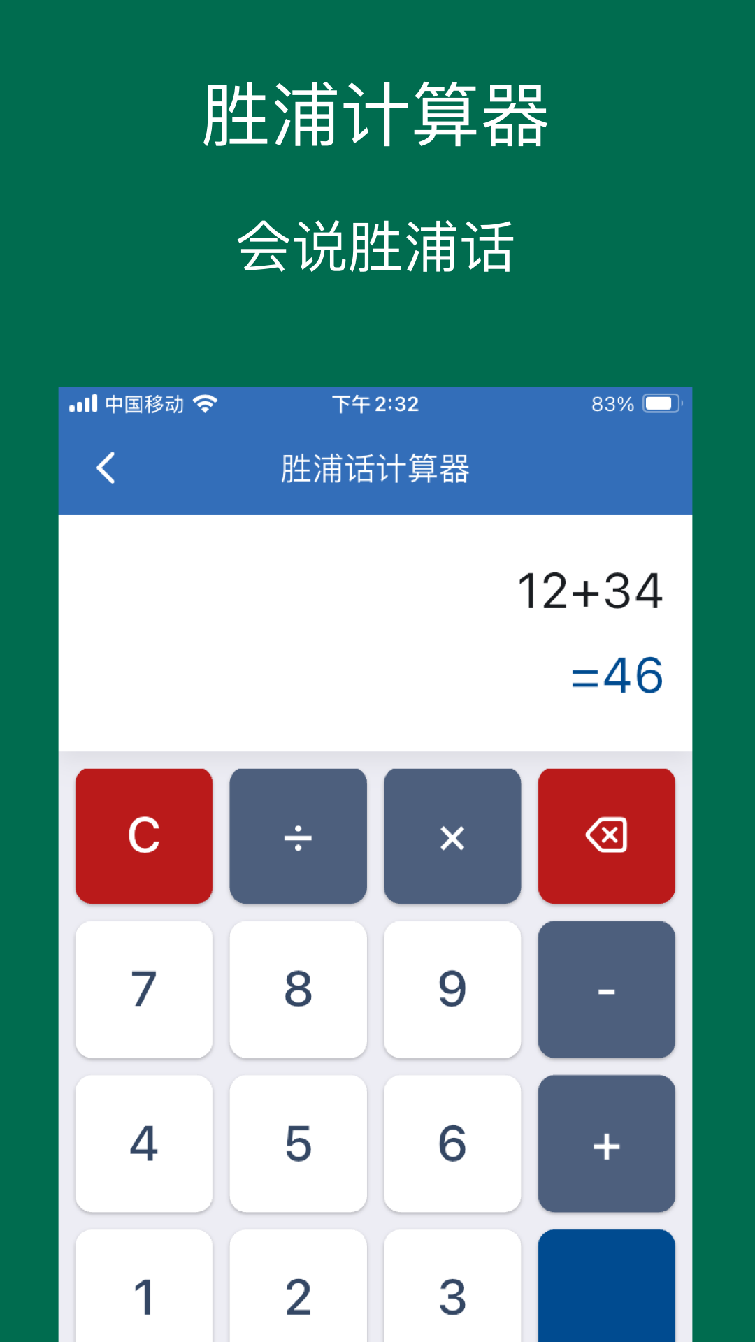 3、在常规计算基础上增加“胜浦话语音播报”开关,按下“=”立即用方言朗读结果,实时播放。