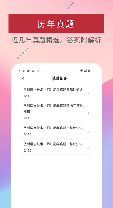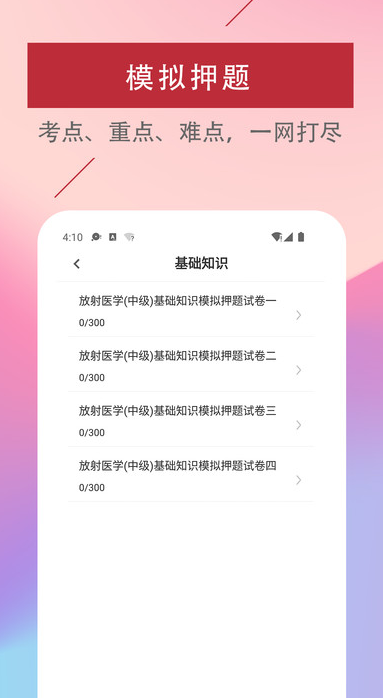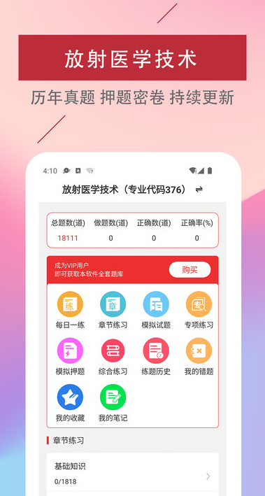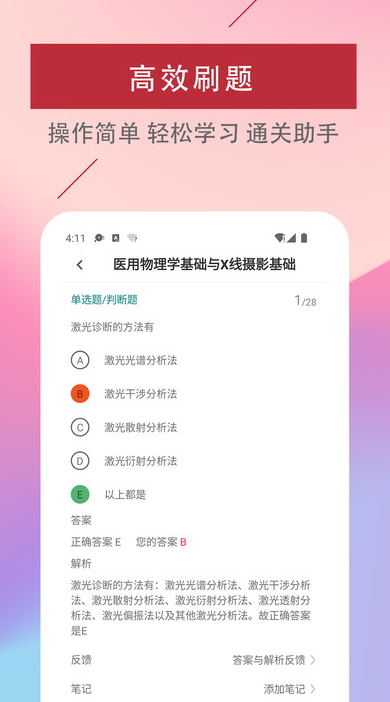 放射医学技术易题库app是一款专为医学生提供的在线刷题备考学习软件,在这学习操作简单,每天都可以自由在线打卡,用户可以关注最新的备考大纲,也可以及时优质的在线进行复习学习,系统将会记录你的备考错题,你也可以快速在线收藏难题,有手机就可以快速在线复习,无需等待,比你花钱去参加各种培训班复习更高效,助你轻松通过考试。