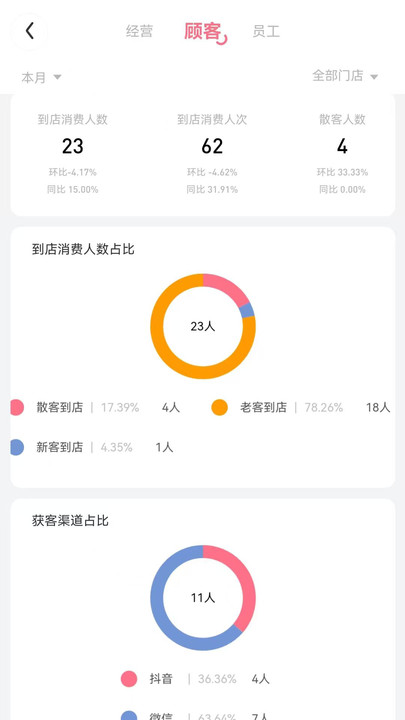 2、系统提供十九种数据模型,从会员生命周期、项目利润、复购曲线到员工人效全方位可视化,老板早晨醒来即可看到昨日营收、客流与转化率,决策有据可依。