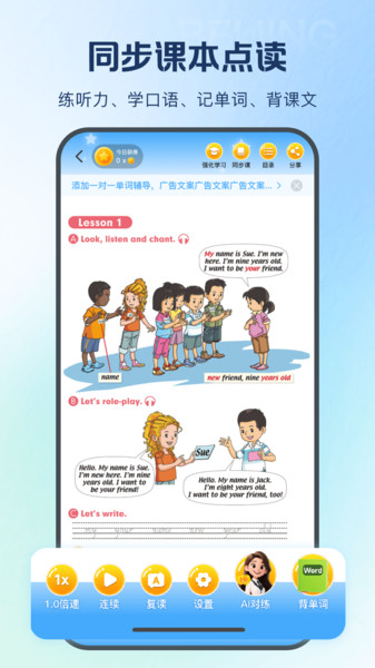 倍进英语点读app是一款专业的英语学习辅助工具,和中小学教材同步更新,平台提供教材点读、口语训练、语法专项等多元化学习模块,配备标准发音示范和实时跟读评分。它有智能记忆系统根据遗忘曲线安排复习计划,游戏化闯关模式激发学习兴趣,护眼界面设计和分层教学内容适应不同学段需求,完整的学习记录让家长随时了解进度。