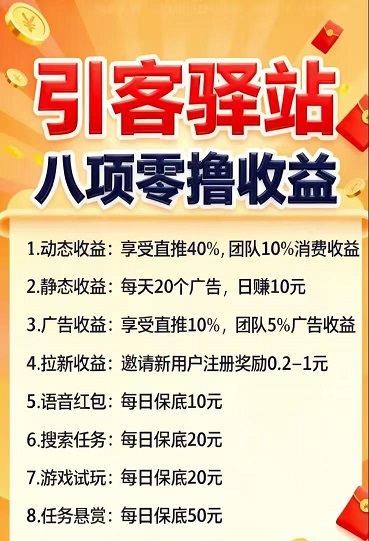 引客驿站app是一款0撸必赚的任务悬赏平台, 软件提供了超多任务项目,比如看视频广告、分享链接、邀请好友注册、注册登录、打卡签到等,不同的任务都会相对应的奖励,还有趣味游戏任务等你来,不仅可以体验游戏的乐趣,还可在玩游戏的同时赚奖励,一举两得。在平台上获得的奖励都可以兑换成红包,并且还可以通过微信提现。