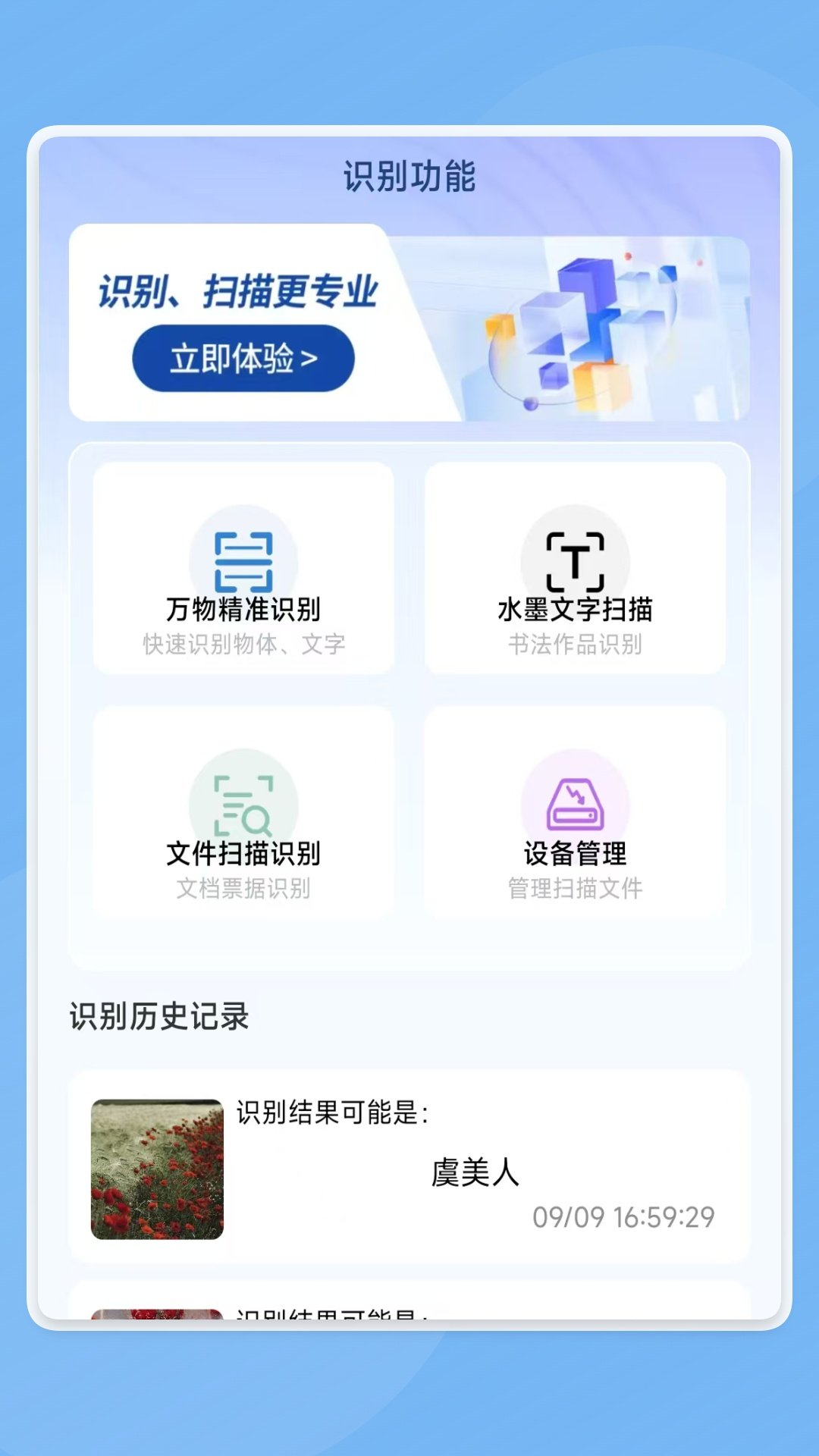 2、支持万物精准识别、水墨文字扫描、文件扫描识别、设备管理等;