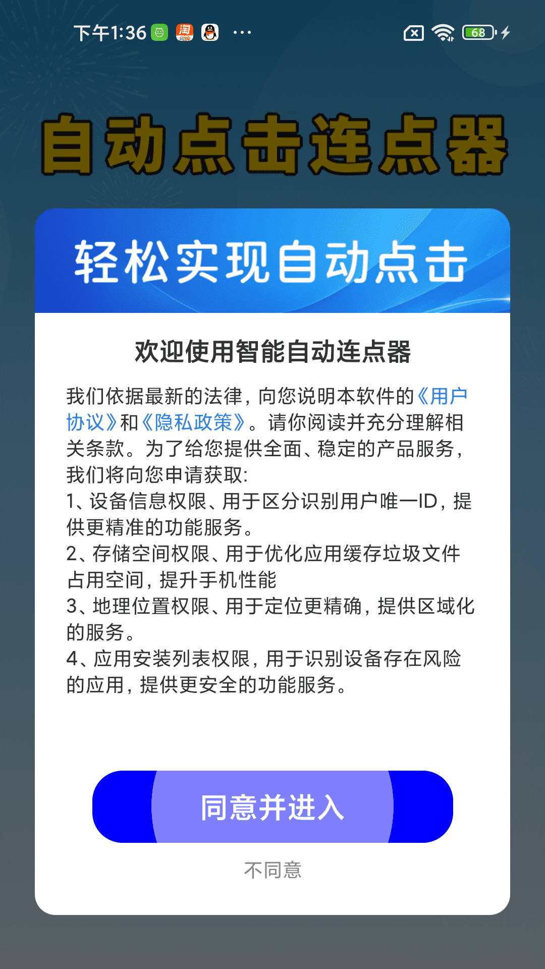 2、进入首页可以看到丰富的功能,提供权限即可设置连点参数。
