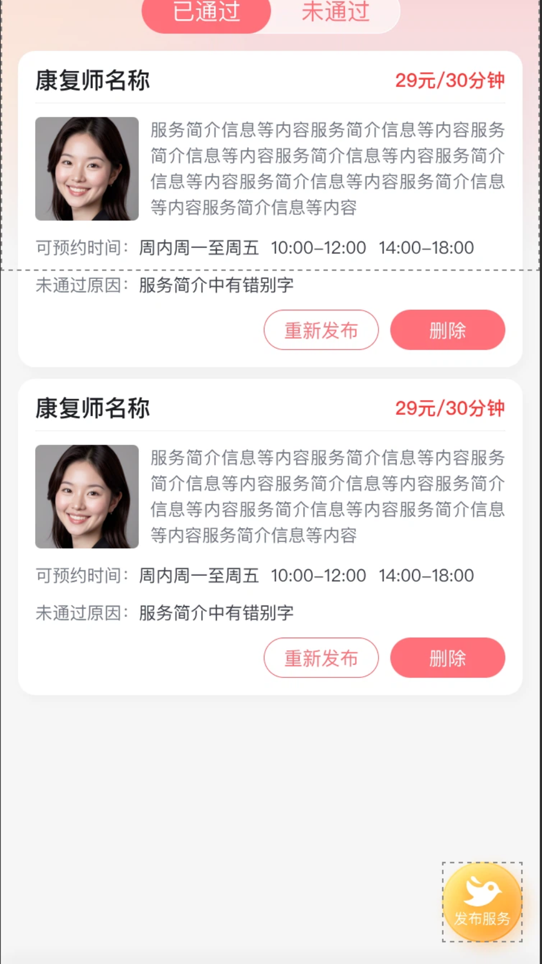 3、允许康复师根据自身专长、经验及服务内容(时长、频率)自主定义并发布服务项目,平台提供市场参考价辅助定价。