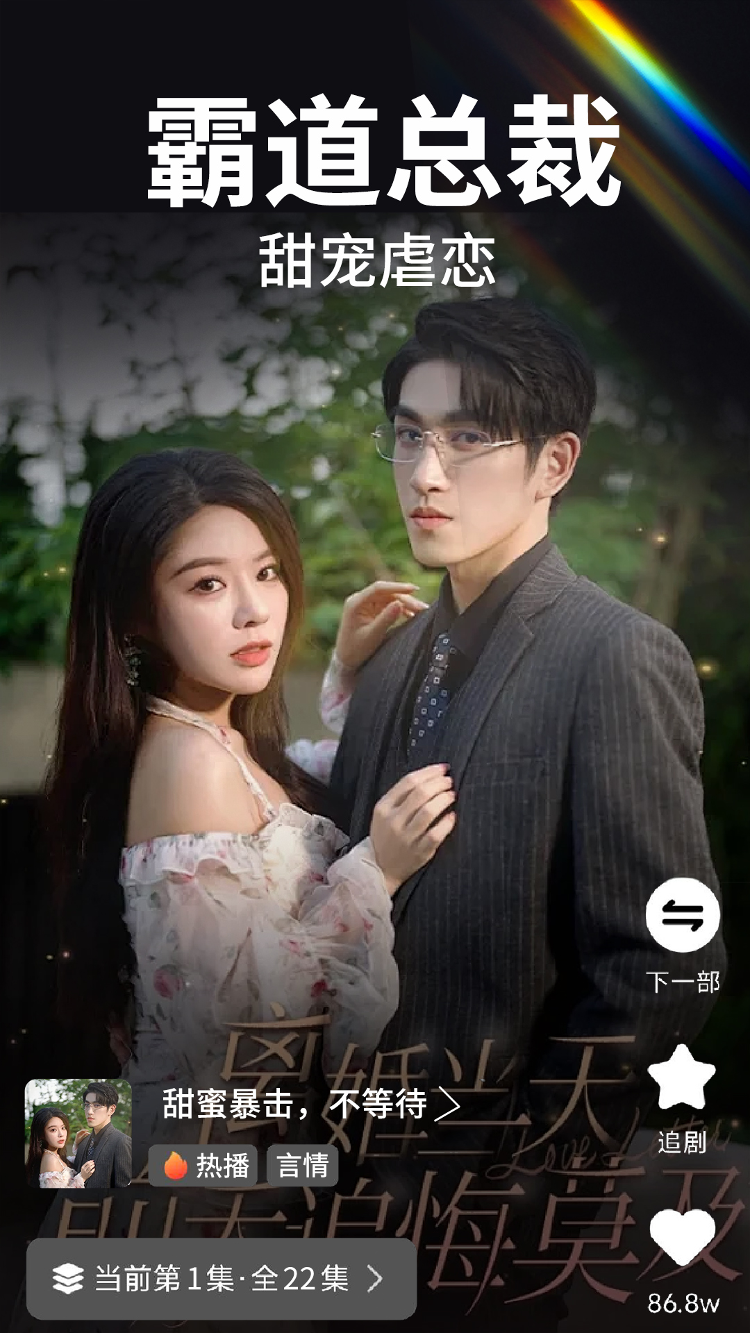 1、首页按甜宠、逆袭、霸总等热门标签分类展示剧集,并根据用户观看历史进行个性化内容推荐。