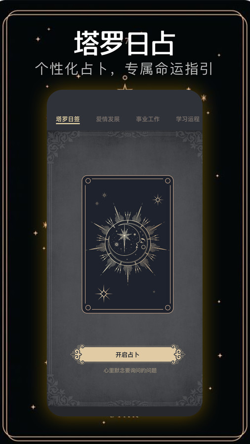 2、提供涵盖爱情、事业、决策等不同主题的多种预设牌阵,用户可选择并针对具体问题抽牌获取详细解读。