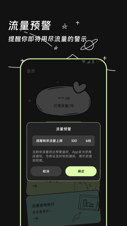 1、可设置套餐百分之五十八十百分之一百三个阶段提醒,每到达阈值即弹窗并语音播报,防止超额扣费,学生党不再因看直播而爆表。