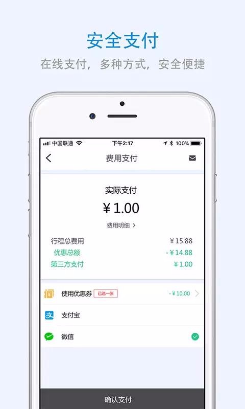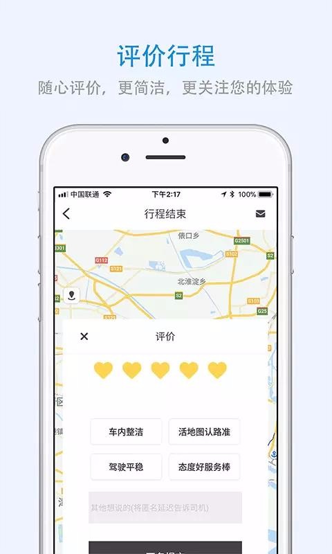 3、行程结束后可通过微信、支付宝等多种方式在线支付车费,并可为当次服务与司机进行自主评价反馈。