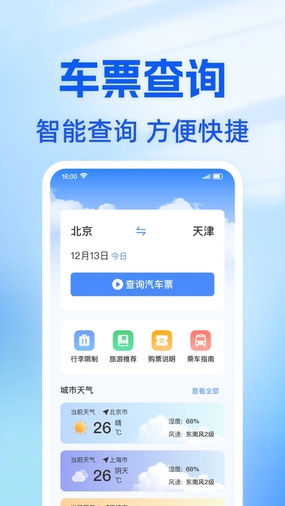 1、用户在首页中可以查询各种车票余票信息动态,支持查询汽车票与火车票。