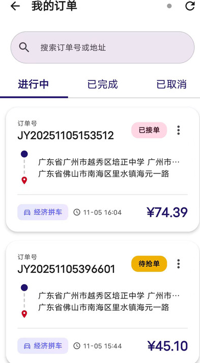 3、系统自动生成个人订单,订单状态实时更新,涵盖待接单、已匹配、运输中、已完成等全流程节点。