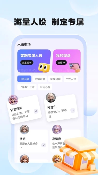2、提供人设市场,特别适合日常聊天必备,可让双方的情感进行升温。