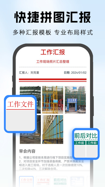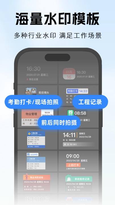 2、软件内置超百款水印模板覆盖工程巡检执法取证防疫消杀等二十余类职场场景,用户一键切换即可快速生成专业影像,减少现场编辑时间,提高外勤工作效率。