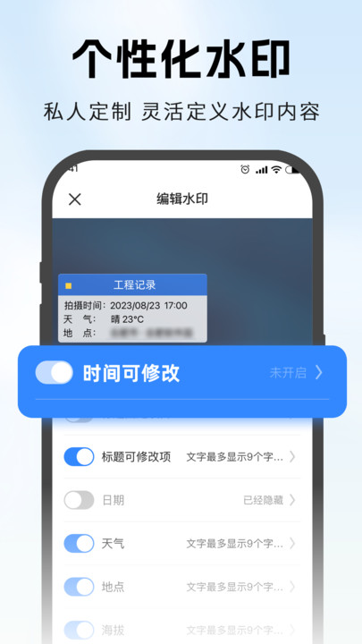 水印相机免费改app一键生成工作日志功能,将多张带水印照片自动排版成PDF报告,附带时间轴与定位地图,施工监理每日巡检结束即可秒发汇报,领导查阅直观高效,软件启动速度低于一秒,拍摄完成即刻保存,后台运行内存占用低于八十兆,老旧手机也能流畅使用,长时间外景拍摄不发热不卡顿,保障连续作业,内置防篡改机制,水印一旦生成即写入图像EXIF并加密哈希,第三方软件修改会提示校验失败。