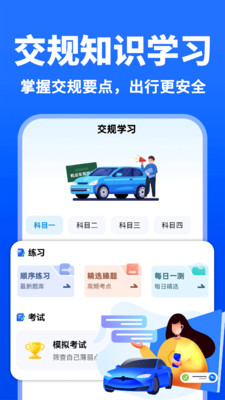 2、能够学习交规,进行练习和模拟考试,科目一到科目四的知识都有涵盖;