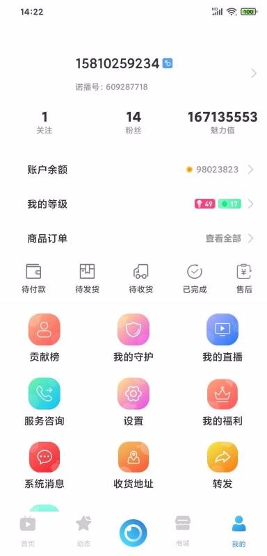 4、来到软件我的页面可使用账户余额、我的等级、商品订单、贡献榜等功能。