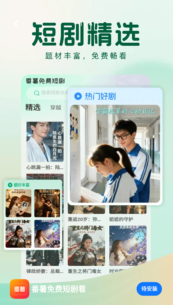 番薯免费短剧看app是一款手机看视频短剧的平台,以汇聚全网丰富多样的短剧资源为亮点,搭配热门剧集简介速览、上头短剧沉浸式畅享以及便捷实用的便签仓库功能,为用户精心营造一场既充满娱乐趣味又兼具实用价值的独特体验,无论是热衷于奇幻穿越剧的幻想派,还是钟情于重生逆袭剧的励志派,亦或是沉醉于浪漫言情剧的感性派,app都能全方位满足您对短剧世界的所有憧憬。