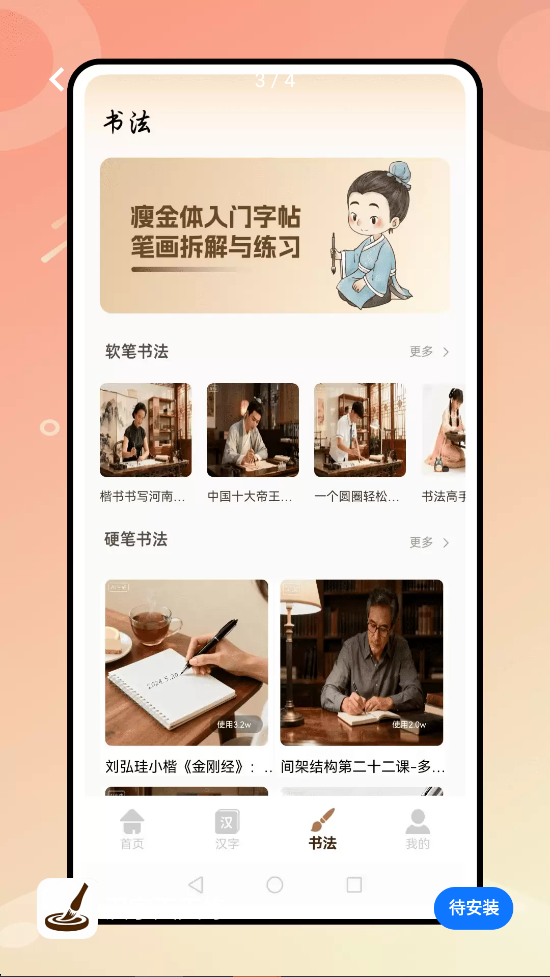 3、书法研习,线上临摹功能逼真,模拟宣纸书写质感,配合大师运笔示范视频,从入门到精进步步领航。