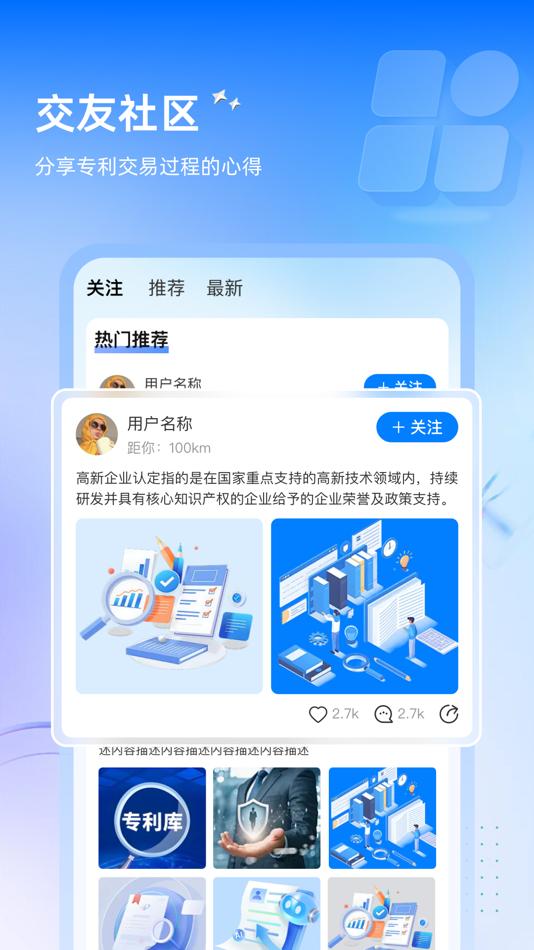 1、把专利挂牌、竞价、签约全流程搬到手机,权利人上传证书即可发布,买家滑动比价,十分钟完成线上撮合,大幅缩短交易周期。