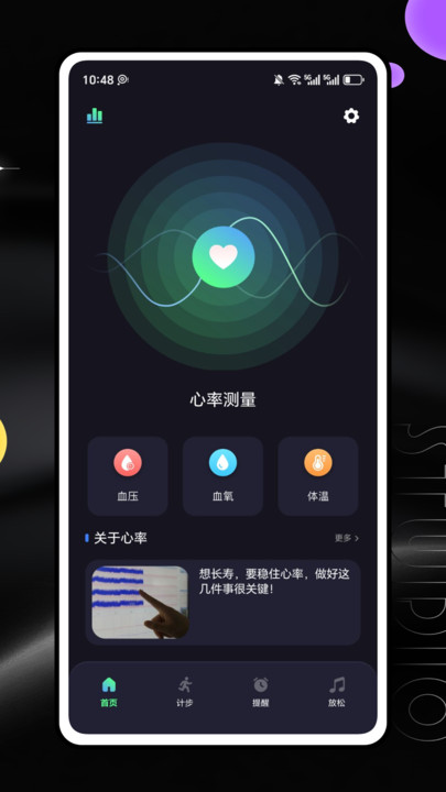 1、首页支持心率、血压、血氧、体温的测量服务。