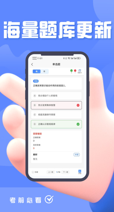 2、答题操作极简,拿起手机即可开启无限在线学习,随时都能高效利用时间刷题。